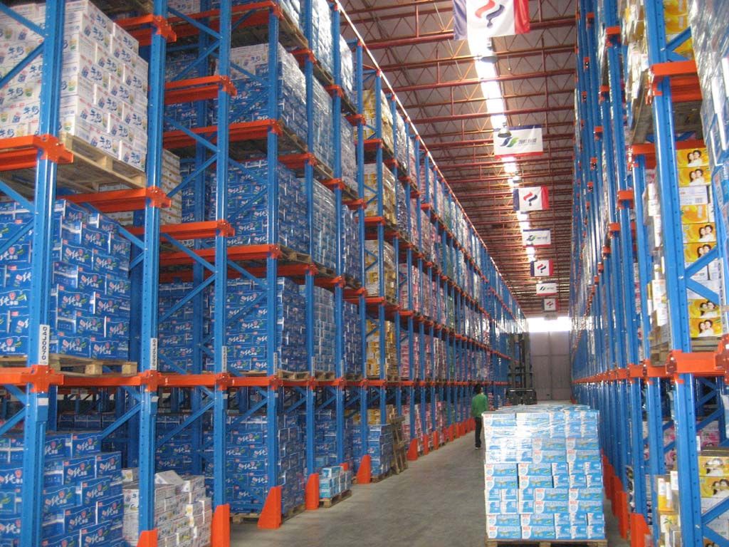 貫通式貨架又稱(chēng)通廊式貨架或駛?cè)胧截浖?。貫通式貨架可供叉?chē)(或帶貨叉的無(wú)人搬運(yùn)車(chē))駛?cè)胪ǖ来嫒∝浳?,適用于品種少,批量大類(lèi)型的貨物儲(chǔ)存。貫通式貨架除了靠近通道的貨位,由于叉車(chē)需要進(jìn)入貨架內(nèi)部存取貨物,通常單面取貨建議不超過(guò)7個(gè)貨位深度。為提高叉車(chē)運(yùn)行速度,可根據(jù)實(shí)際需要選擇配置導(dǎo)向軌道,與貨位式貨架相比,貫通式貨架(駛?cè)胧截浖埽┑膸?kù)空間利用率可提高30%以上,貫通式貨架(駛?cè)胧截浖埽V泛應(yīng)用于批發(fā)、冷庫(kù)及食品、煙草行業(yè)。